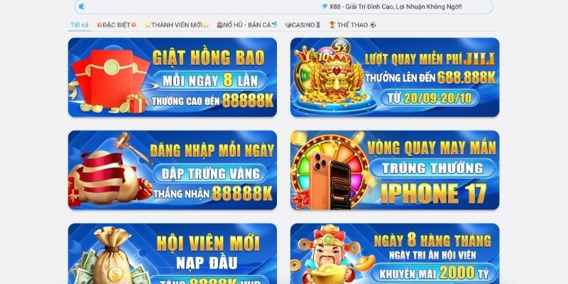X88 thường xuyên tung ra nhiều chương trình khuyến mãi giá trị cho cả thành viên mới và cũ. Từ ưu đãi nạp đầu, hoàn trả, đến sự kiện theo mùa, tất cả đều được thiết kế để mang lại lợi ích cao nhất cho người chơi. Đây cũng là yếu tố khiến X88 giữ chân được cộng đồng đông đảo và gắn bó lâu dài.